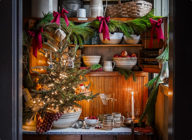 We keep taper candles lit in our windows, and incorporate a simple bow on just about anything to transform the space. For us, remembering to add touches to our pendant lights and window ledges are always first stops.