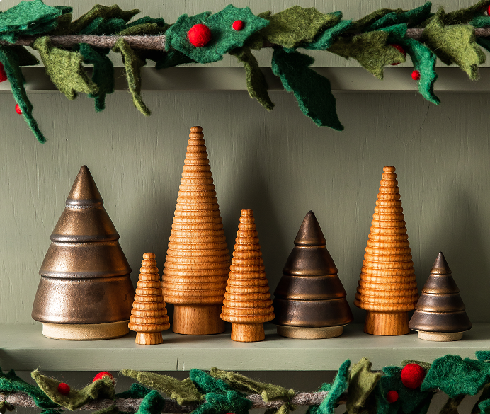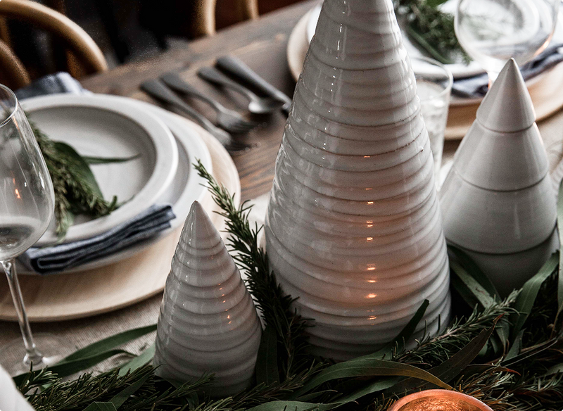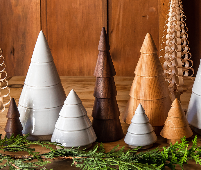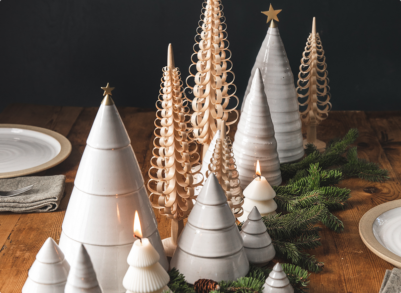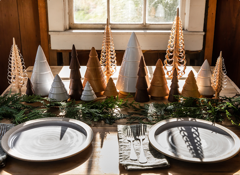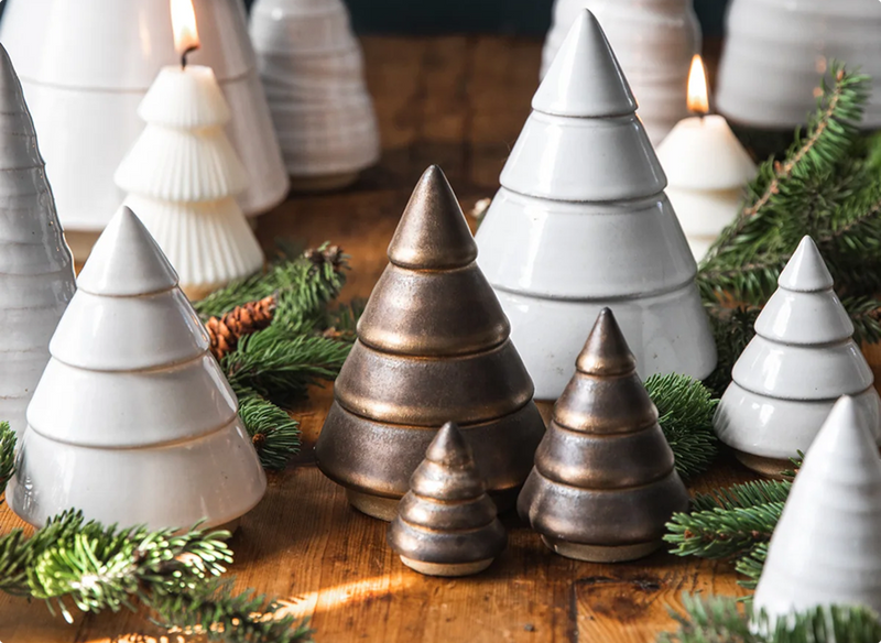 Since then, the Farmhouse Forest has continued to grow. The Spruce Woodland Trees are the embodiment of snow-laden trees and a classic Farmhouse design, showcasing our classic throw marks from the makers’ hands. The Antique Bronze Balsam Trees were introduced in the classic four-step design with a soft shimmer to complement our ceramic and wood trees.
