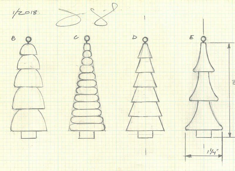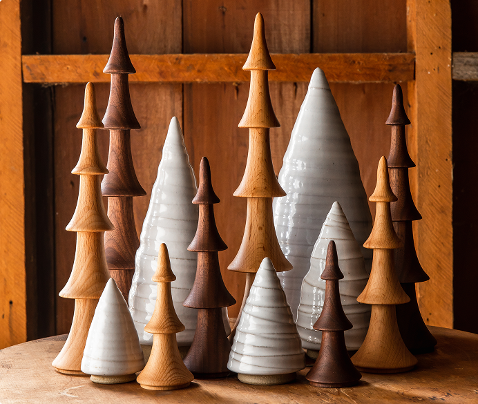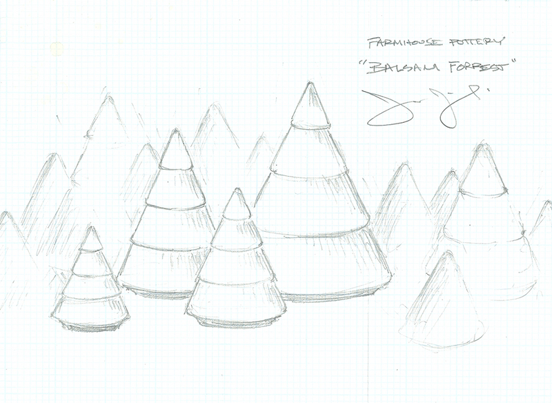 Shortly after the Balsam was created, James began to think beyond ceramics. Inspiration from a photo of European whittling and his long-time interest in mixed media led to the Crafted Woodland Evergreen Trees, carved with the same stepped design that defines the Balsam collection.