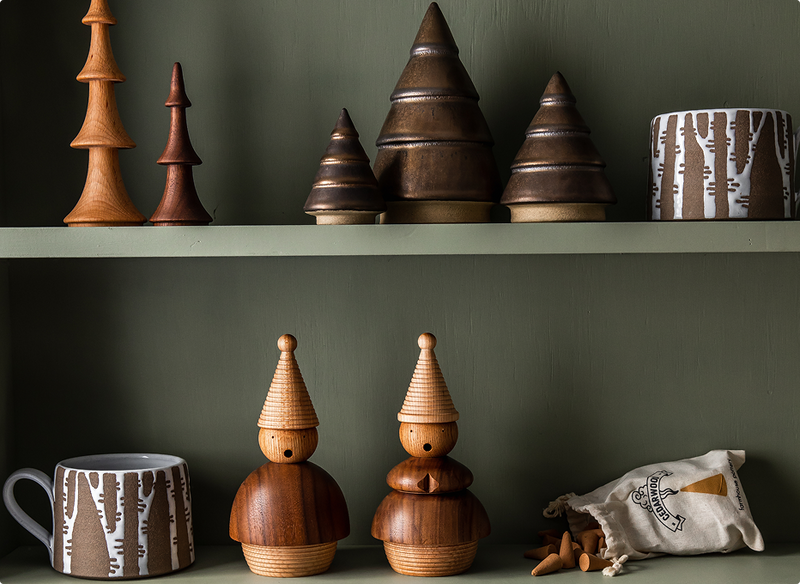 For James, these pieces are deeply nostalgic — carrying inspiration from the mantels of his childhood holidays. While countless iterations have been developed over the years, he keeps the prototypes at home and slowly builds his own forest with each evolution.