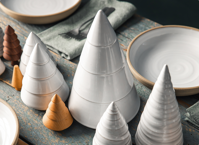 The ceramic Balsam Woodland Trees came first, with their distinctive conical silhouettes capturing the shape of New England’s prevalent evergreen. The four-stepped design became a signature element that remains unique to Farmhouse.