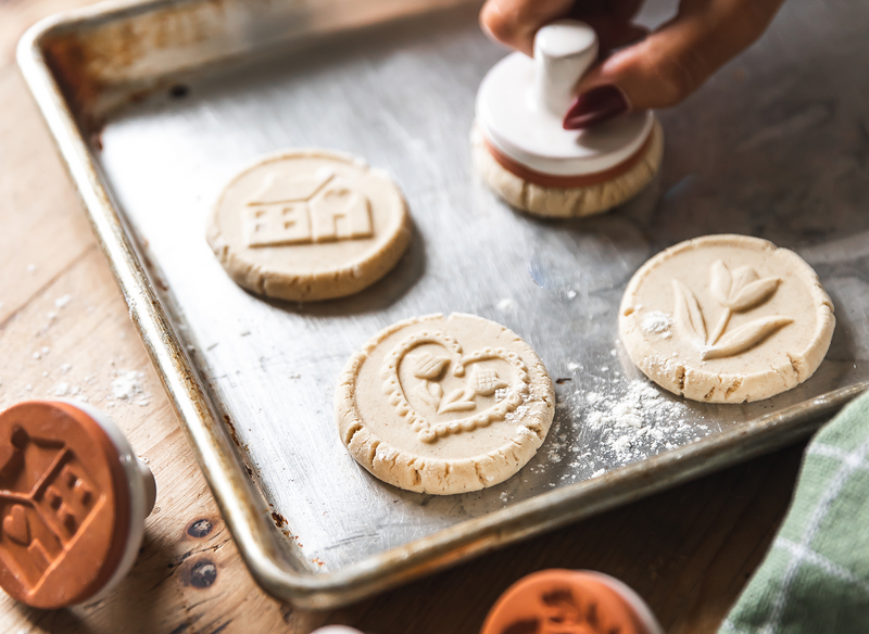 These stamps have been handmade by a single family in the USA since 1968. Each piece is crafted from terracotta and finished with our classic Farmhouse white glaze. The designs pay homage to antique Scandinavian designs and heirloom cookie stamps that are passed down through generations. The designs are hand-carved, and each stamp is individually cut, imprinted, and glazed — using the same processes for the last 50 years.
