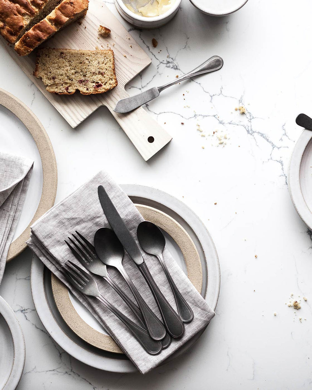 The development of our place settings all started with the mission to revive an American cutlery factory based in New York. Each set is tumbled alongside ceramic material, giving every piece the special, pottery-inspired patina.