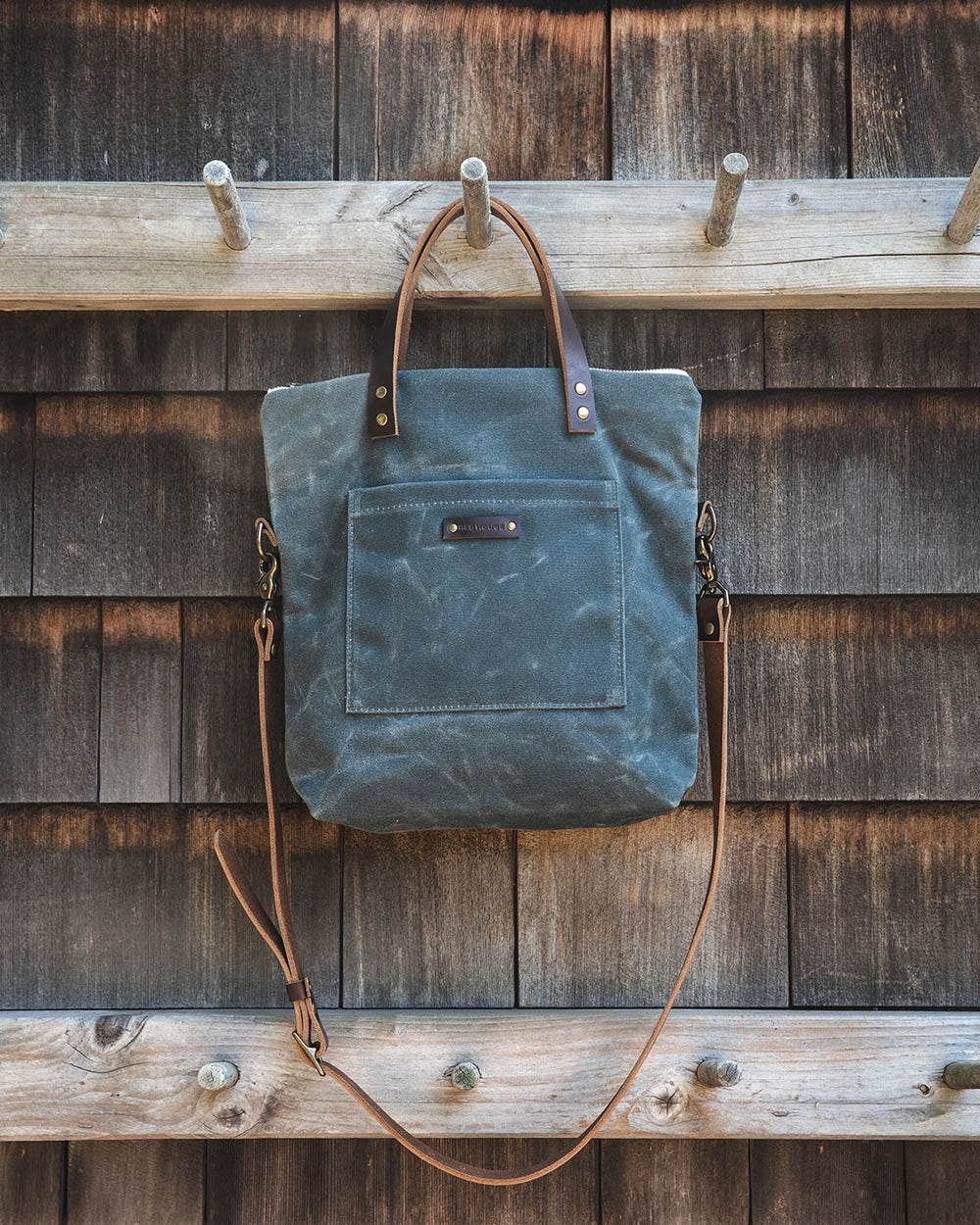 Waxed Canvas Shell, French Ticking Interior, One Exterior Pocket, Antique Brass Zipper Closure