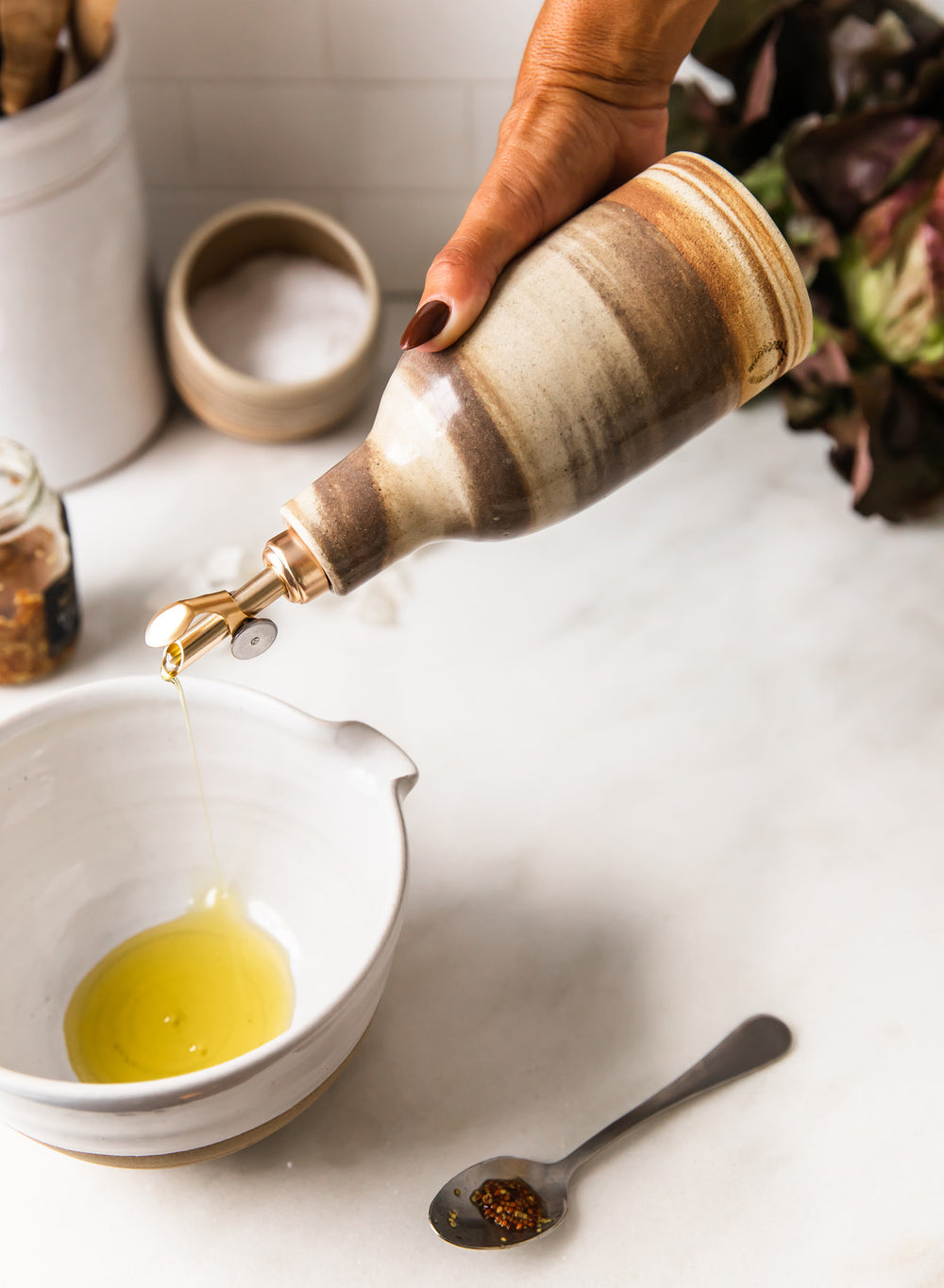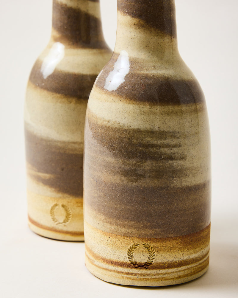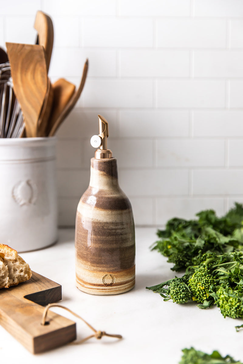 Each of our Marbled Stone Oil Bottles is a celebration of nature’s beauty and our potters' craft. Crafted using multiple types of clay that are skillfully wedged and wheel-thrown, these bottles reveal striking marbled patterns reminiscent of agate and layered stone. Designed for olive oil, dressings, or simple countertop beauty, no two are ever alike — each one a functional, one-of-a-kind work of art.
