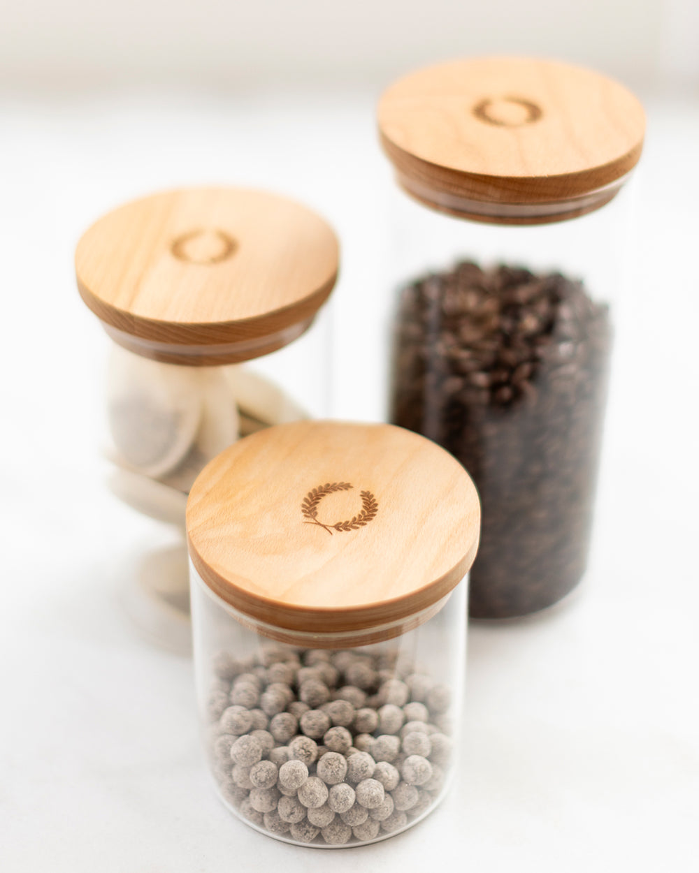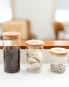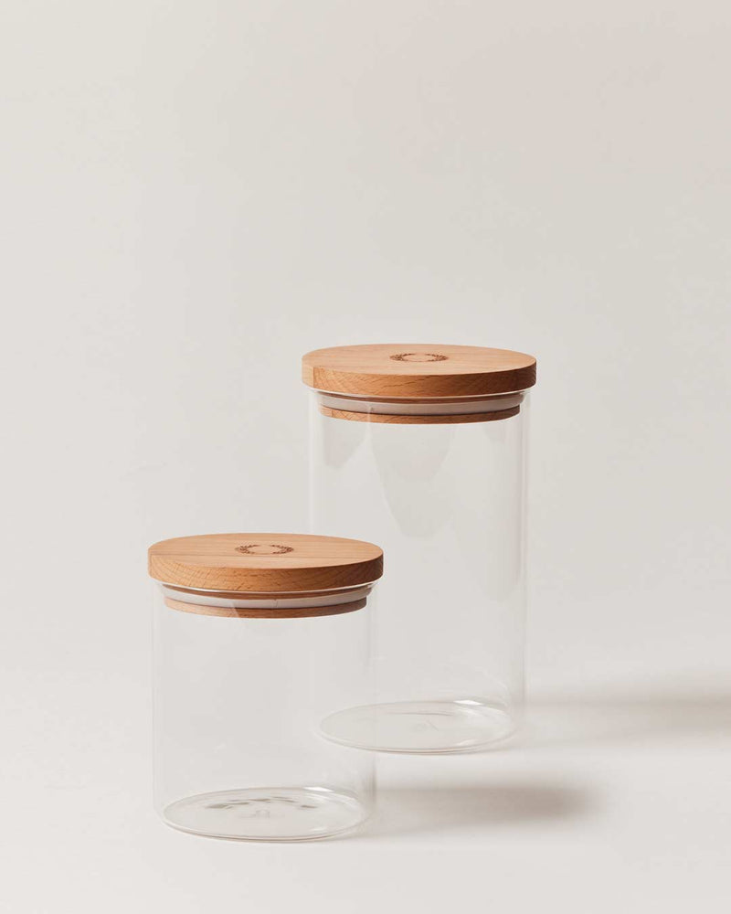 Borosilicate glass with beechwood lid and silicone seal. Borosilicate glass is known for its exceptional durability, clarity, and resistance to temperature changes. This premium glass is often used in science labs and kitchens alike for its strength and lasting beauty.